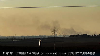 樽谷・増山両監督は11月28日にはガザまで1キロ地点にあるギバットコビ地区まで、国際免許を持つ樽谷監督の運転で移動。ガザ地区北部からは肉眼でも確認できる大量の黒煙が上がっていた。この時点では、休戦中であったになぜ攻撃が? ガザに在住する提携ジャーナリストの、サメハ・アハメッド氏に確認すると、煙が上がっているガザ地区北東部にある街は、ベイト・ハヌーンと言って10月7日の攻撃以前、人口は約32,187人だった。パレスチナ自治政府加盟地域内に位置している。