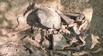 見つかった男性の遺体は、棺に納められず、仰向けで胸の上に大きな石が置かれていた。