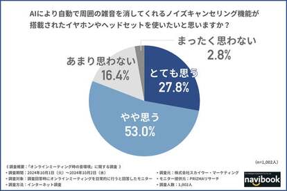 「AIにより自動で周囲の雑音を消してくれるノイズキャンセリング機能が搭載されたイヤホンやヘッドセットを使いたいと思いますか?」と質問したところ、『とても思う(27.8%)』『やや思う(53.0%)』『あまり思わない(16.4%)』『まったく思わない(2.8%)』という結果になりました。