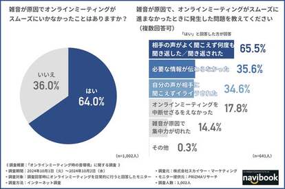 「雑音が原因でオンラインミーティングがスムーズにいかなかったことはありますか?」と質問したところ、6割以上の方が『はい(64.0%)』と回答しました。