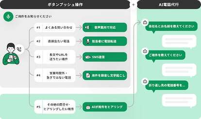 電話応答の分岐を自由に設定でき、AIによる自動応答・予約代行や、録音、文字起こし・AI要約、SMS送信、顧客管理(CRM)、LINEやチャットツールへの着電通知など、豊富な機能をご利用いただけます。また、企業等が取得した「03」等から始まる固定電話番号での受発信が可能です。さらにその番号で外出先での受発信もできます。