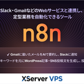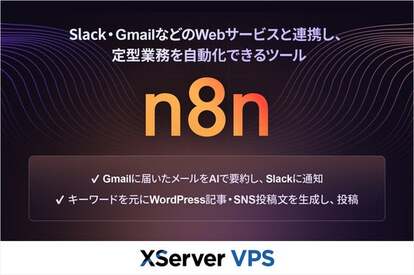 「n8n」は、ノーコード・ローコードで多様なアプリケーションやサービスを連携させ、業務の効率化を実現できるワークフロー自動化ツールです。『XServer VPS』で提供する「n8n」アプリイメージを利用することで、初期費用無料・月額830円から、複雑な設定を行うことなく、簡単に「n8n」の利用環境を構築できます。