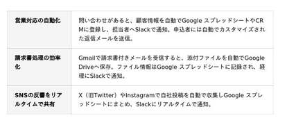 対応サービスはGmail、Slack、Google スプレッドシート、Notion、Salesforceなど多岐にわたり、定型業務の自動化、情報管理、通知フローの構築など、さまざまなビジネスシーンで活用できます。