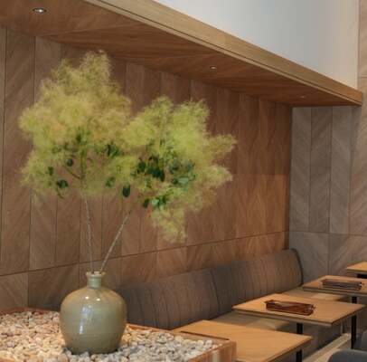 季節が少しずつうつろう様子を愉しみながら、二十四節気にも表れる日本的な感性を取り戻せる場所を提供します。プライベートとオフィシャルの境目のような、それぞれの時間をほっと過ごせる“庭”のような存在のカフェです。店内のインテリアには、四季折々の枝ものをふんだんに取り入れております。