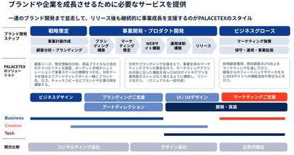 PALACETEX株式会社は、BPaaS領域において、事業戦略設計から現場オペレーションまでを一気通貫で支援するマーケティングカンパニーです。戦略設計力とデジタル実行力を掛け合わせ、創業初期から上場企業までの幅広いクライアントを支援。事業成果にコミットした「売れる仕組み」づくりを提供しています。