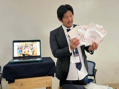 ケニアで行われた国際連合ACUNS学術会議で日本全国の生徒が作成した「なかよしカルタ」を紹介する中村代表