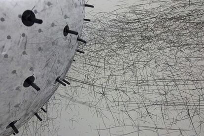 まるで男性がヒゲを剃って1日が経過した毛のような黒い炭片を、巨大なヘリウム風船に無数に取り付け、それを小さな白い部屋に浮かばせ、壁に模様を描くという、奇妙なんだけど斬新な発想のインスタレーション。壁に炭片描かれた絵も、なんていうかこれまた無駄毛っぽく見えてしまうので、ニュルマニアのパルモとしては個人的にはそのキッチュ感が好きだな。