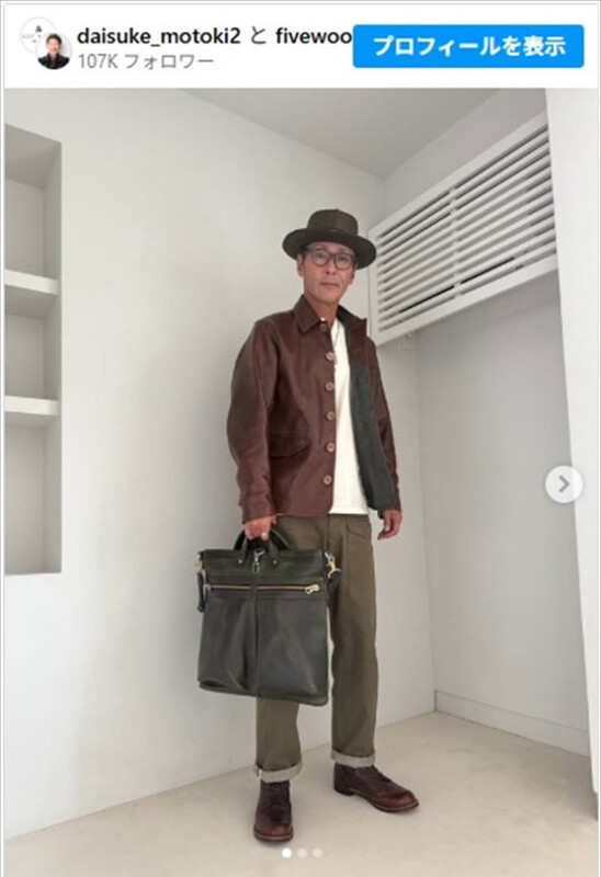 約20キロのダイエットに成功し、スマートになった姿がネットで話題の元木氏。今回の投稿では「お疲れ様です 仕事終わりに!パチリっと ヘルメットバック〜 めっちゃ良い革〜 牛(クロムエクセル、ホーウィン社)オリーブカラー」とつづり、私服姿のソロショットをアップ。オリーブカラーのパンツと革のジャケットを合わせ、ハットを被った姿がダンディでカッコいい。