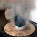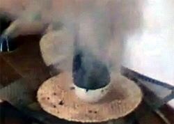 陶器の白いカップのようなものに、p-ニトロアニリンをティースプーン3杯入れ、そこに硫酸をかけてガスバーナーで熱する。すると・・・