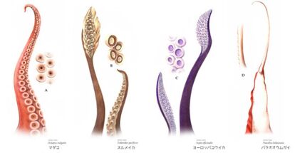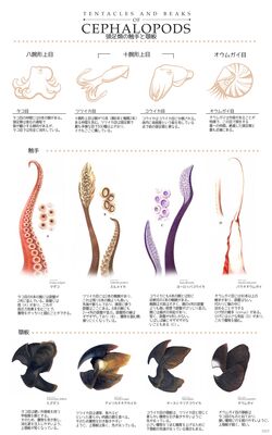 触手は主に無脊椎動物の、頭から伸びる柔らかい突出部分をさす。顎板(がくばん)とはカラストンビとも言い、タコやイカの1対の顎(あご)のことだ。それぞれ「上顎板」と「下顎板」と呼ばれる。外から見える部分は黒色であるが、奥へ行くにしたがって色が薄くなる。