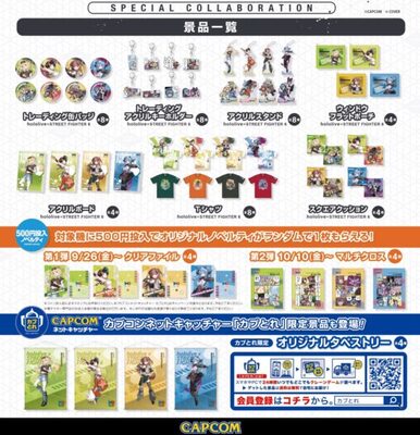 「ストリートファイター6×ホロライブ」プライズ景品が投入されている対象機に500円連続投入で、オリジナルノベルティをランダムで1つプレゼントいたします。