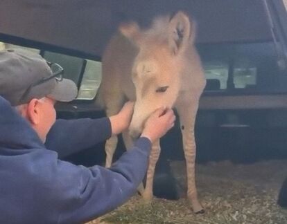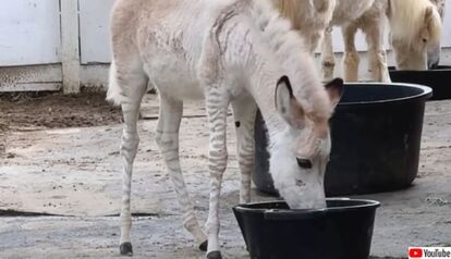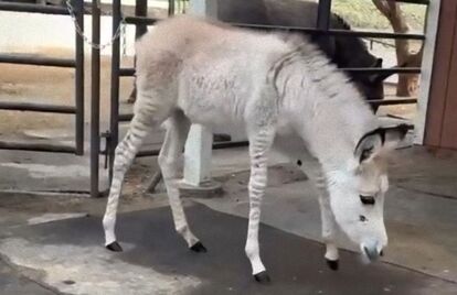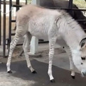2025年3月、アメリカ、カリフォルニア州の馬やロバの救助保護施設に、珍しいシマウマとロバの交雑種、ゼブロイドの「ゾンキー」の赤ちゃんが到着した。