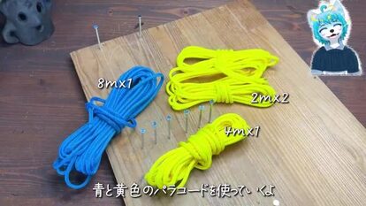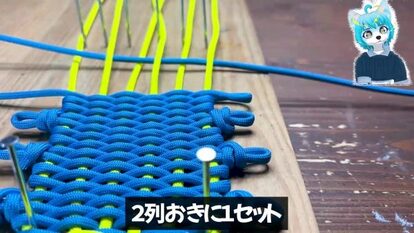 使用するのは、板に釘を打って作ったジグと、青と黄の2色のパラコード。通常のわらじの編み方に少しアレンジを加えて制作していきます。