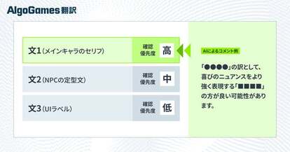 『AlgoGames 翻訳』では、AIが翻訳を行うだけでなく、自ら「確認優先度」「その理由」「別訳案」を提示します。この「AI申し送り」により、プロ翻訳家は翻訳の要点を即座に把握し、修正の要否や改善方針の判断をスピーディーに行うことが可能となります。