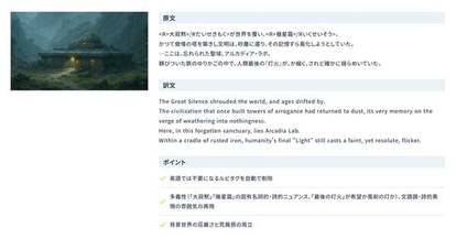 以下は、プロ翻訳家による翻案・編集・校正を加えていない(ライトプラン相当)の翻訳サンプルです。通常は追加の編集・校正を推奨していますが、チェックの結果、修正なしで実装となるケースもあります。※本サンプルは品質の一例であり、すべての翻訳結果が同等の品質となることを保証するものではありません。