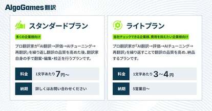 『AlgoGames 翻訳』は、独自の新技術を用いた翻訳方式により、高品質な翻訳を低価格かつ短納期で提供するゲーム向け翻訳サービスです。2024年8月のサービス提供開始からわずか1年で翻訳作品数は100タイトルを突破し急速に利用を広げながら、ゲーム翻訳のさらなる効率化と品質向上を実現しています。
