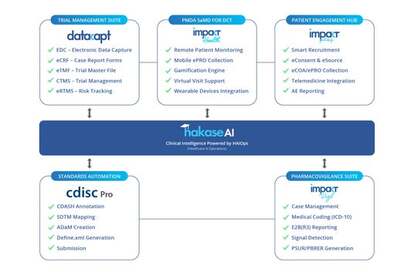 EDC(電子データ収集)、eCRF(症例報告書)、eTMF(臨床試験マスターファイル)、CTMS(臨床試験管理)、eRTMS(リスク追跡)を統合。