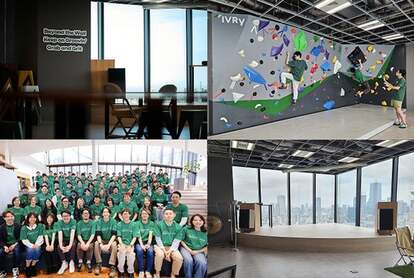写真・左上から:社内に飾っているValue、社内のボルダリングウォール、集合写真、社内ステージ