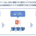 今回追加した「AIスライドマージ」を使用すると、社内に蓄積されたスライドの中からAIが最適なスライドを自動で選び、デザインやトンマナを統一したドラフト資料を自動で作成します。