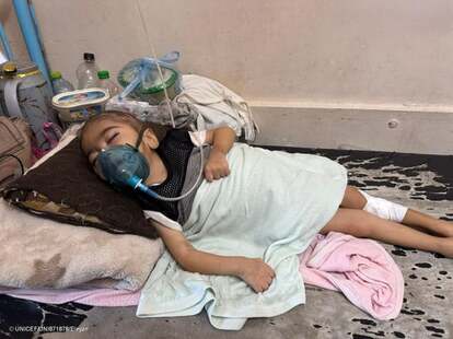 ガザ地区南部にある病院で、重度の急性栄養不良のために治療を受ける1歳の女の子(パレスチナ、2025年10月1日撮影) (C) UNICEF/UNI871878/Eleyan