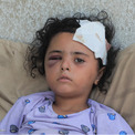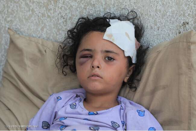 ガザ市の避難民キャンプで、友達と遊んでいた時に近くで爆撃があり、その破片でけがを負った6歳のマリアムさん。頭蓋骨を骨折し、脳に血腫ができた娘を見て、父親は「私たちが逃げられる場所はもう空しかない」と話す(パレスチナ、2025年9月16日撮影) (C) UNICEF/UNI865578/Nateel