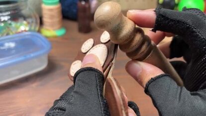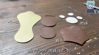 肉球を縫い付けたら、磁石を内側に仕込みながら本体に貼り付けます。他のパーツも貼り付けたら、ケガキしてから菱目打ちをします。続いてコバ処理を行います。