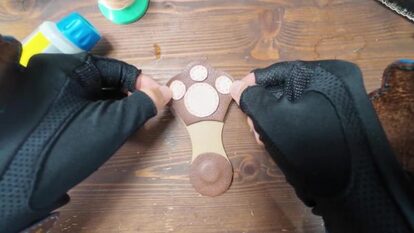 まず手掛けるのは、マグネット式のマーカーホルダー。デザインにはシリーズおなじみのキャラクター・アイルーの手をモチーフに採用しました。ベースカラーはベージュ、柄はブラウン、肉球はピンクと、公式カラーをイメージした配色です。