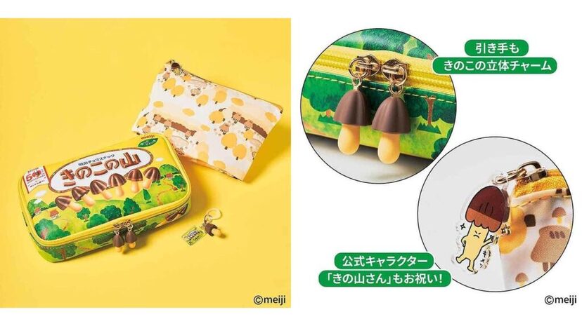 メインのポーチは50周年記念限定のパッケージをモチーフにしており、背面まで実際の商品を忠実にオマージュしたデザインだ。また、引手もきのこの山を模した立体チャームとなっている。