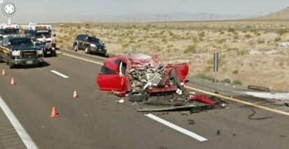 グーグルストリートビューが事故直後をとらえた写真は幾つか存在するが、この写真は特にすごい。赤い車は後部座席以外が大破して粉々になっており、残されたのは鉄くずとも思える後部座席だけである。