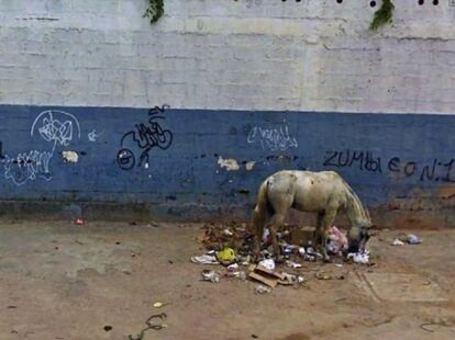 ストリートビューには時に悲惨で、胸に刺さるような切ない瞬間が記録されることもある。この画像は一匹のポニーが泥にまみれた姿でゴミをあさっている様子が写し出されている。