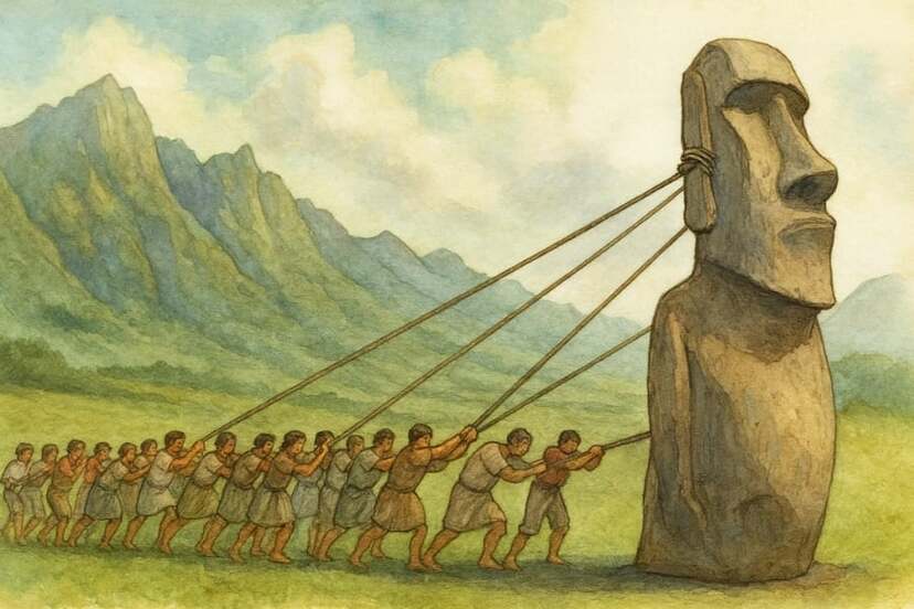 たった18人でロープを使い、片側ずつ引くことで、モアイ像を40分で100メートルも前進させることに成功しました。