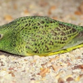ヒメフクロウインコは、緑色に暗褐色や黒、黄色の斑点が入った羽をまとう、比較的小型のインコである。