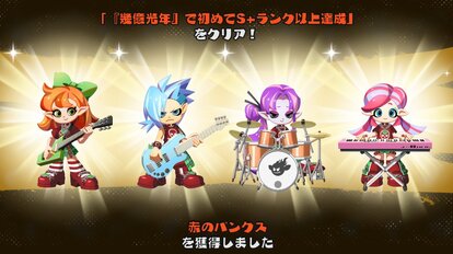 本作では、プレイを進めていくと、進行状況や成績に応じて実績解除やさまざまな報酬を獲得できます。報酬として、プレイ可能な楽曲数が増えるほか、バンドメンバーとなるキャラクターやロビー画面の背景などをカスタマイズできるパーツも手に入ります。