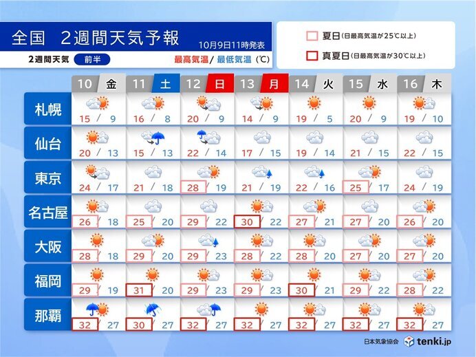 最高気温は、福岡や名古屋で30℃以上の真夏日の日があるなど、沖縄や九州から東海では暑さが続くでしょう。関東や東北は、日ごとの気温差に注意が必要です。