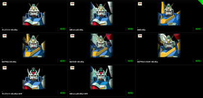 投票できるガンダムには、兵装などによるバージョン違いなどもすべてラインナップ。たとえばVガンダムでは、「ヴィクトリーガンダム」と「V2ガンダム」で計9種類が投票対象となっている。
