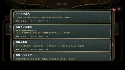 いつでも自由に質問・解答できる「クラシックルール」と、質問や解答のタイミングが決められた「ターン制ルール」の2つの遊び方のどちらかを選択して遊ぶことができます。