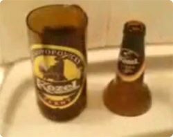用意するものは、紐、アセトン(ネイル用)、ライターにゴム手袋のみ。紐をビール瓶に巻いて結んでカット。その輪をアセトンに浸し、ビール瓶に通してそこに火を点火。ほどよいころに水を張ったシンクの中でゴム手袋をしながら手でグイっと切断するというもの。凄く簡単そうに見えるけど、実際どうなんだろうね。覚えておくと何かの役には立つかな?