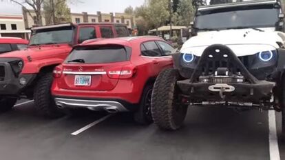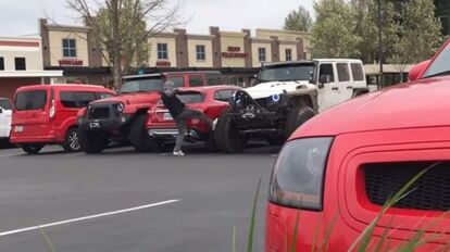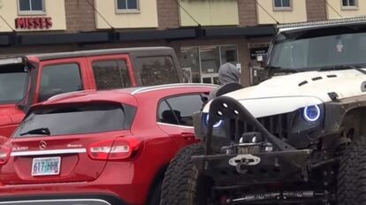 アメリカ・オレゴン州で、番長止めをしている車に対し、2台のジープがこんな方法でお仕置きをした。