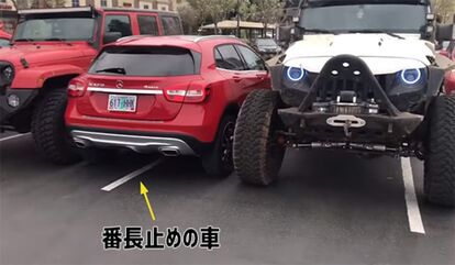 駐車場は他に空いているスペースがあるのだが、赤いジープはベンツの隣のスペースにギリギリの状態で車を駐車させた。