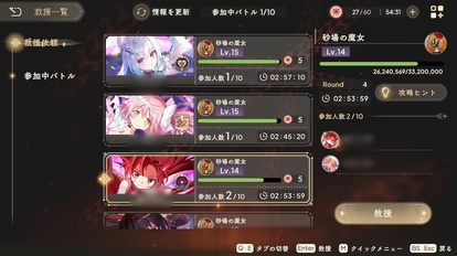 「どうせみんな最大レベルのLv20だけ戦ってるんでしょ?」と、思ったそこのあなた、実際にはそんなことはなくて、Lv.1~20さまざまなレベル帯のボスが救援一覧に並んでいる。そのため、自分の戦力にあった難易度を選ぶことができる。