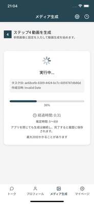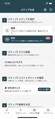 アプリ内のメディア生成画面に表示される「動画生成」ボタンからご利用ください。