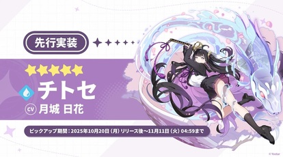 今回は正式リリース日が決定したとともに、チトセ(CV.月城日花さん)が先行実装されることが明らかになった。ピックアップ期間は10月20日(月)から11月11日(火)4:59までとなっている。