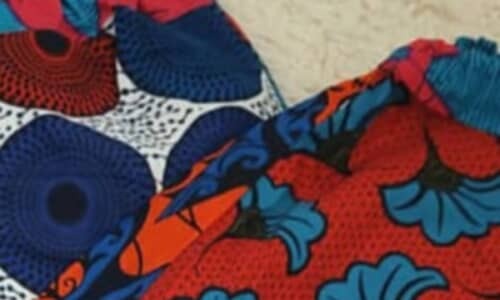 作品には、投稿者さんの“推し”でもあるアフリカンファブリックをふんだんに使用。お母さん用には8枚はぎのスカート、Tシャツ、ヘッドアクセを、息子さん用には2種類の生地を組み合わせたタックパンツとTシャツ、さらにハギレを活用したブレスレットを制作しました。どれも“万博カラー”が入った柄布を上手に組み合わせています。