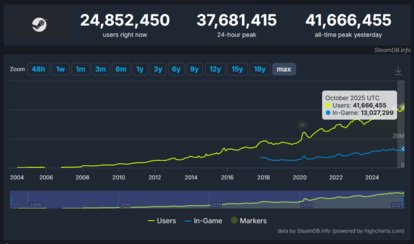 10月13日、PCゲーム配信プラットフォーム「Steam」の同時接続ユーザー数が、過去最高となる4166万6455人を記録し、初めて4160万人の大台を突破したことが明らかになった。