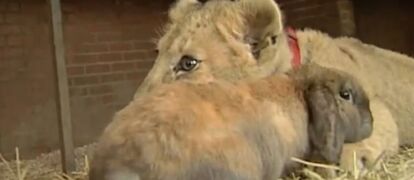 イギリス、スコットランドの首都エディンバラで、ウサギや犬と仲良く遊び、仲良く暮らしているライオンの子ども「シンバ」さん。生後13週のシンバさんは冬に病気になり、動物園から民家に移され、家の中で育てられることとなった。