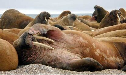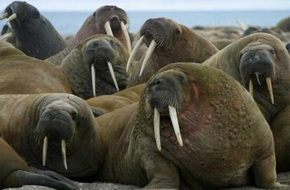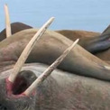 群れでハーレムを作ることで知られている北極生まれのセイウチたち。その群れが一堂に介してお昼寝タイム。まるでウォーターベッドのようなふかふかのその体にダイブしたい気持ちになっちゃうわけだけど、オスの牙がところどころ突き出ているので。ダイブするには注意が必要かもしれないね。