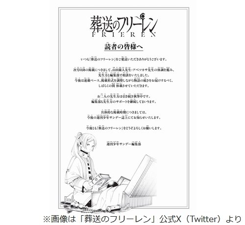 「週刊少年サンデー」編集部は10月15日、連載中の人気マンガ「葬送のフリーレン」について、「しばらくの間休載させていただきます」と発表した。
