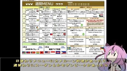 落雁さんが訪れたときの週間メニュ―がこちら。料理名に添えられた国旗が様々ですね。あまり馴染みのない国の料理を食べることができそうです。これは関西拠点でのメニューですが、似たようなメニューを扱っている拠点は多そうとのこと。