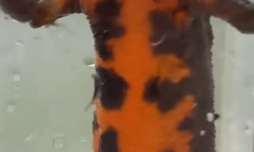 引き続きガサガサをしている中で、ふと網の中を見たひろりるさんがなにやら大興奮している様子。網に入っていたのは本日初、そしてチャンネル初となる、両生類の「アカハライモリ」でした。アカハライモリはその名前の通り、おなかの色が赤いことを特徴とするイモリで、環境省のレッドリストでは「準絶滅危惧(NT)」に分類されています。