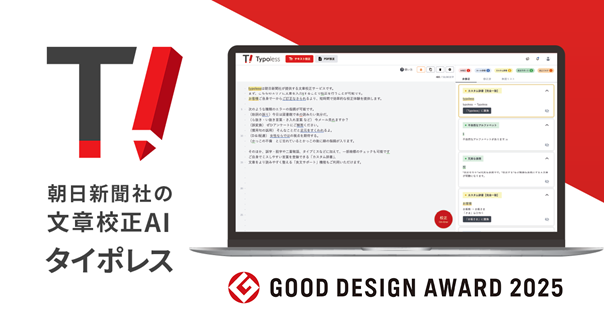 株式会社朝日新聞社(代表取締役社長CEO:角田克)の文章校正AI「Typoless(タイポレス)」が2025年度グッドデザイン賞を受賞しました。